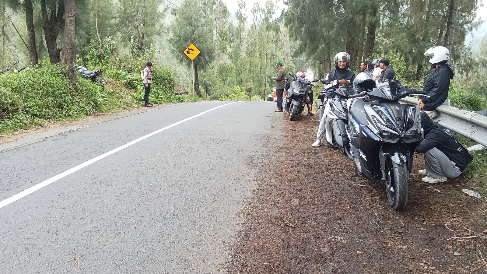 Ia menambahkan, warga menyebar di berbagai titik jalur, khususnya di area curam, untuk menghentikan pengendara motor matic yang hendak melintas.